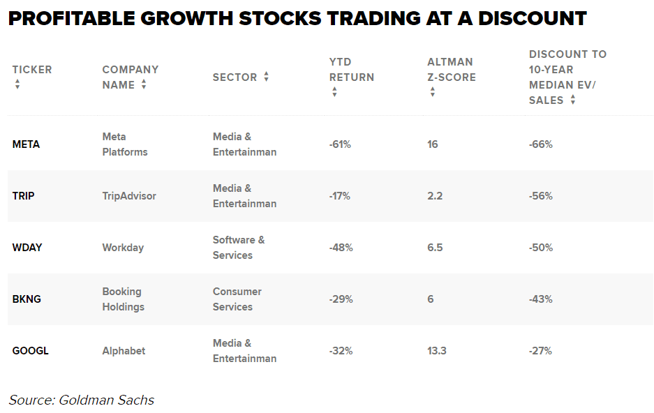 Mezi akcie, které Goldman Sachs našel, patří velké technologické společnosti, jako je Meta Platforms a Alphabet, které byly v letošním roce silně zasaženy, ale v budoucnu by mohly růst. Například společnost Meta Platforms se letos propadla o více než 60 %, ale obchoduje se se solidním 66% diskontem vůči svému desetiletému mediánu EV/tržby.