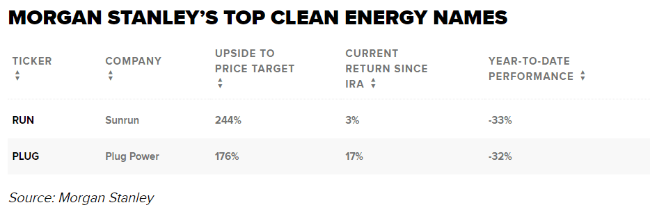 Mezi akcie s nejvyšším přesvědčením společnosti Morgan Stanley patří Plug Power a Sunrun, z nichž druhá jmenovaná by se podle firmy mohla ztrojnásobit. Na akcie této společnosti stanovila cílovou cenu 79 USD, což znamená 244% nárůst oproti čtvrtečnímu závěru.
