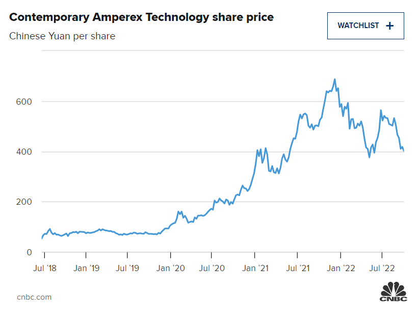 Akcie společnosti CATL, největšího světového výrobce baterií pro elektromobily, letos klesly o 30 %, ale za posledních pět let vzrostly o více než 650 %.