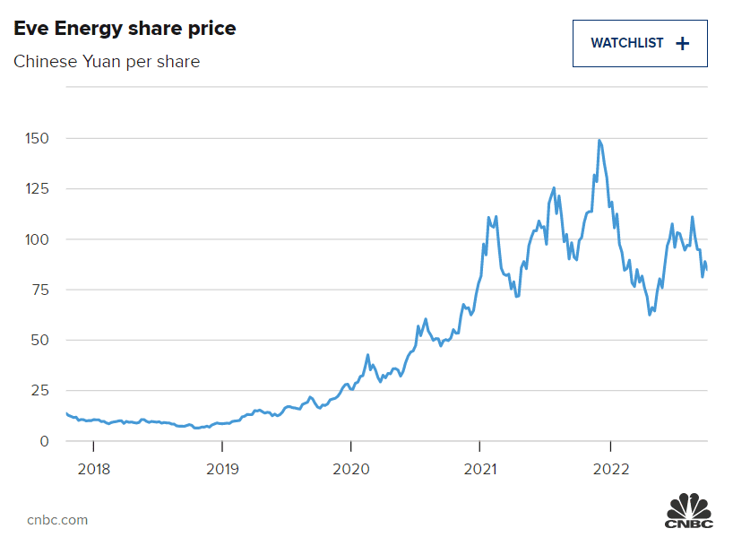 Podobně společnost Eve Energy zaznamenala letos pokles ceny svých akcií o 25 %, ale za posledních pět let vzrostla o 530 %.