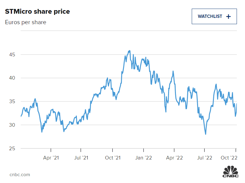 STMicroelectronics Podle analytiků Bank of America by akcie výrobce polovodičů měly do července příštího roku vzrůst o 108,4 % na 71 eur (71 USD) oproti současné úrovni.