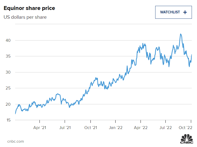 Equinor Equinor je další energetickou společností, kterou doporučuje Bank of America Global Research. Analytici očekávají, že akcie norské společnosti vzrostou o 24 % na 453 norských korun (43 USD).