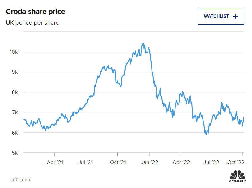 Croda Společnost Croda, která vyrábí speciální chemikálie, je nyní bez dluhů poté, co na začátku tohoto roku prodala aktiva v hodnotě 700 milionů liber (797 milionů USD). Bank of America proto předpovídá, že čistá rozvaha bude v době rostoucích úrokových sazeb přínosem pro cenu jejích akcií.