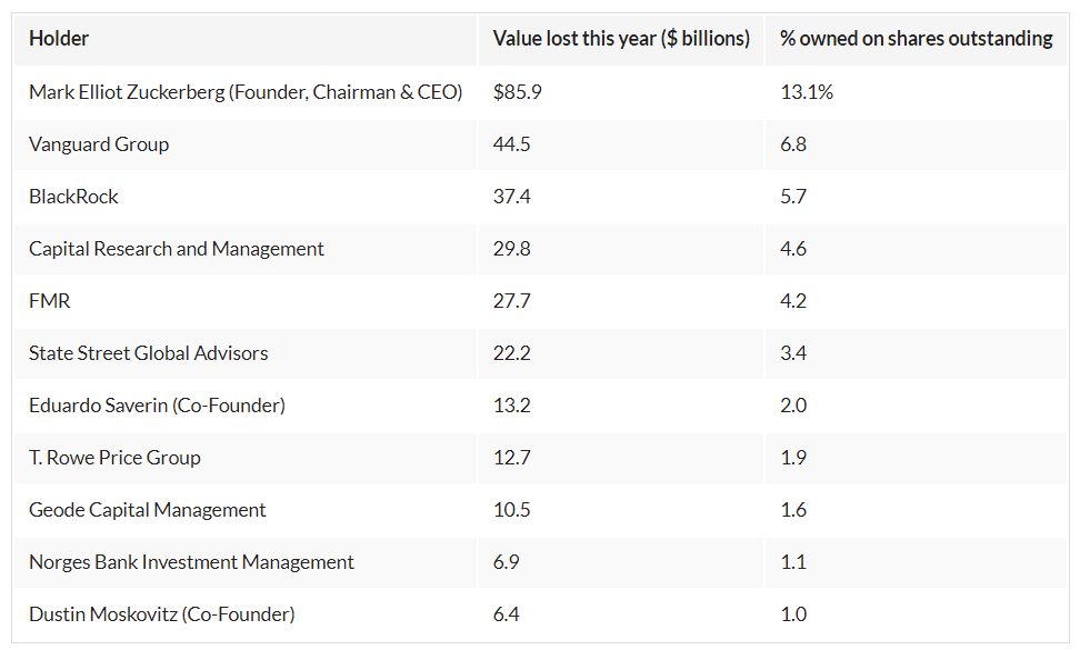 Bude to muset být jeden z investorů, kteří drží největší ztráty.Pouze deset investorů do Meta, kromě Marka Zuckerberga, včetně mnoha gigantů ETF, jako jsou Vanguard a BlackRock , drží největší podíl ve společnosti dříve známé jako Facebook, uvádí analýza Investor’s Business Daily na základě údajů společností S&P Global Market Intelligence a MarketSmith. Jako skupina vlastní třetinu společnosti, čímž překonávají i Zuckerbergovu pozici číslo 1 s 13 %.A právě tito investoři mohou nejvíce ztratit na rozhodnutí společnosti před rokem přejít od lukrativních sociálních médií k mdlé virtuální realitě. Sledovali, jak v letošním roce zmizela tržní hodnota jejich vlastních současných pozic ve výši více než 211 miliard dolarů. Ztratili dokonce více než Zuckerberg, který přišel o 85 miliard dolarů.„Meta, která se už tak těžko přizpůsobovala změnám v politice sledování mobilní reklamy společnosti Apple, zaznamenala v zářijovém čtvrtletí meziroční pokles příjmů z reklamy o zhruba 4 %,“ uvádí zpráva společnosti S&P Global Market Intelligence. „Meta se v současné době zaměřuje ze sociálních médií na budoucí metaverse, což se investorům také nelíbí.“Zdroj: Getty ImagesDebakl společnosti MetaInvestoři společnosti Meta platí vysokou cenu za rozhodnutí společnosti změnit zhruba před rokem svůj byznys.Jen v letošním roce se akcie společnosti Meta propadly o více než 73 % na 89,48 bodu. To z tržní hodnoty společnosti srazilo více než 650 miliard dolarů. Ztráta tržní hodnoty společnosti Meta je větší než hodnota 99 % společností v indexu S&P 500 jednotlivě. Meta se tak zároveň stala nejhůře se vyvíjející akcií v indexu S&P 500 v tomto roce.A pokud vlastníte podílové fondy a ETF, držíte v rukou velkou část tohoto pytle ztrát také. Samotná společnost Meta má 17% podíl ve fondu Communication Services Select Sector SPDR , 12% podíl ve fondu Vanguard Communication Services ETF a 10% podíl ve fondu iShares Global Communication Services ETF .Chcete využít této příležitosti?Ozvou se však tito giganti ETF?Kdo drží v ruce největší balíky?Meta je mezi společnostmi z indexu S&P 500 poněkud neobvyklá tím, že zakladatel Zuckerberg je stále hlavním akcionářem s 347,8 milionu akcií. Obři ETF však jako skupina vlastní ještě více než on.Zdroj: Getty ImagesSpolečnost Vanguard je se 180,4 milionu akcií držitelem číslo 2. To představuje více než 6,8 % společnosti. A kvůli této obrovské velikosti pozice Vanguard letos na akciích prodělal více než 44 miliard dolarů.Další ETF gigant, společnost BlackRock, je třetím největším držitelem akcií společnosti Meta se 152 miliony akcií v hodnotě 5,7 % společnosti. Společnost BlackRock se letos na akciích propadla o více než 37 miliard dolarů. Pětici největších držitelů uzavírají další hráči na poli ETF a podílových fondů, například mateřská společnost American Funds Capital Research s pozicí 4,5 % a Fidelity FMR s 4,2 %.V první desítce zůstává i několik spoluzakladatelů, jako Eduardo Saverin s 2% pozicí a Dustin Moskovitz s necelým 1 %. Bude však záležet na velkých fondových společnostech, které se potřebují ozvat. Aktivističtí investoři zatím vlastní jen nepatrnou část společnosti. New York State Common Retirement Fund vlastní pouze 0,18 % a D.E. Shaw 0,13 %.Otázkou nyní je, zda se nějací aktivisté nechají zlákat náhle nižší cenou společnosti Meta?Největší propadlíci společnosti MetaNejvětší držitelé akcií společnosti Meta Platforms a jejich dosavadní papírové ztráty v letošním roce