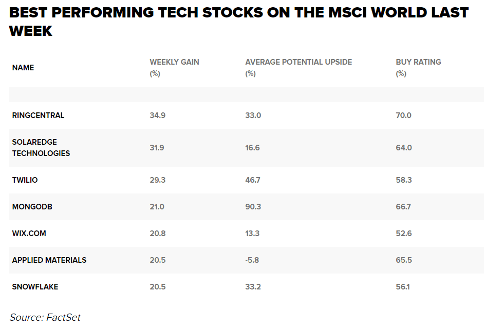 Není překvapením, že akcie technologických společností patřily minulý týden k nejúspěšnějším individuálním akciím na světě. Z 25 akcií světového indexu MSCI, které zaznamenaly více než 20% růst, jich sedm pocházelo z technologického sektoru.