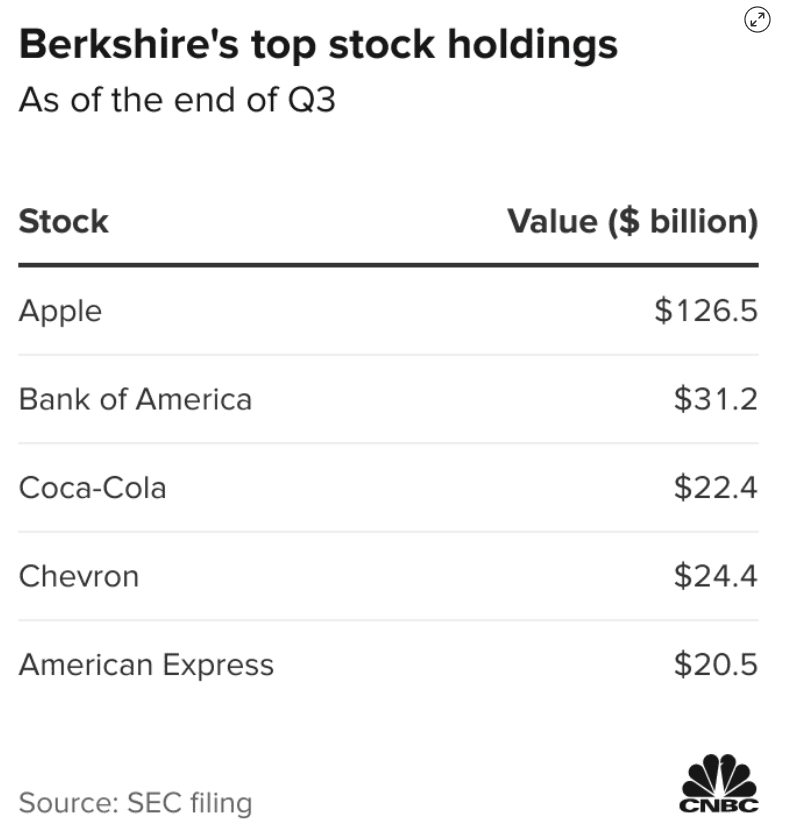 Společnost Apple byla na konci září stále zdaleka největším podílem Berkshire s hodnotou 126,5 miliardy dolarů. Technologický gigant se stal Buffettovou oblíbenou akcií díky svým kvalitním produktům, loajální zákaznické základně a také velkému programu zpětného odkupu akcií společnosti. Ve třetím čtvrtletí akcie vzrostly o 1 %.