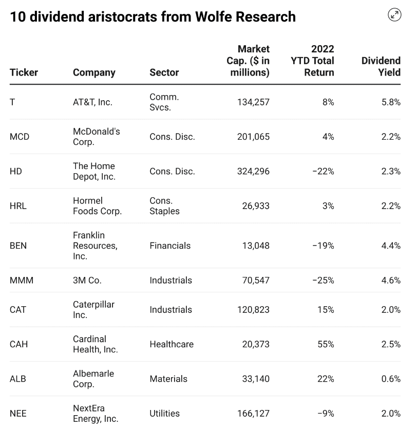 Dividendoví aristokraté mají dlouhou historii zvyšování dividend. Navíc tyto akcie podle společnosti Wolfe Research obvykle překonávají širší trh při vstupu do recese i při výstupu z ní. Když se ekonomika nachází v období pozdního zpomalení, jako je tomu nyní, dividendoví aristokraté obvykle dosahují výnosu 8,9 % ve srovnání s indexem S&P 500. V období útlumu se tato výkonnost zvyšuje na 19,2 %.Pro investory je to důležitá úvaha, když uzavírají rok 2022 a připravují se na další volatilitu v budoucnu. Index S&P 500 je na nejlepší cestě uzavřít jeden ze svých nejhorších let v historii, když letos poklesl o 15,5 % a všechny z jeho 11 sektorů kromě jednoho se obchodují v záporných hodnotách.Zdroj: Getty ImagesSpolečnost Wolfe Research provedla screening společností, které v posledních 25 letech trvale zvyšovaly dividendy a jejichž tržní kapitalizace je vyšší než 3 miliardy USD.Zde je 10 jmen:Podle společnosti Wolfe Research společnost McDonald’s v letošním roce dosáhla lepších výsledků a její dividendový výnos činí 2,2 %.Společnost Gordon Haskett označila tento podnik rychlého občerstvení za nejlepší volbu pro rok 2023. Analytik Jeff Farmer v listopadové zprávě uvedl, že McDonald’s je vítězem globálního tržního podílu se stabilními peněžními toky a bezpečným útočištěm pro investory do diskrečních produktů před potenciální recesí v příštím roce. Farmerova cílová cena 300 USD představuje zhruba 10% nárůst.Chcete využít této příležitosti?Home Depot letos klesl o 22 %, ale akcie této společnosti se spotřebním zbožím mají dividendový výnos 2,3 %. Společnost Cowen nedávno zahájila pokrytí akcií s ratingem outperform s tím, že společnost je „nejlepším operátorem ve své třídě“, který může rozšířit podíl.„S tím, jak se ekosystém HD Pro dává dohromady, jsme konstruktivní ohledně příležitosti k růstu podílu, zvýšení produktivity prodeje, zrychlení setrvačníku & rozšíření marže EBIT,“ napsal Max Rakhlenko v říjnovém komentáři. „HD je nejlepším operátorem ve své třídě s vedoucím podílem Pro, což maloobchodníka staví do pozice, kdy lépe odolává zpomalujícímu se pozadí v NT a na druhé straně akceleruje.“Albemarle má celkový roční výnos 22 % a mírný dividendový výnos 0,6 %. Analytici Citi označili výrobce lithia za trojku nejlepších společností a v zářijové zprávě uvedli, že Albemarle má „lepší pozici“, aby mohla těžit z vyšších cen lithia poté, co restrukturalizovala své kontrakty tak, aby zohledňovaly variabilnější ceny. Společnost má rozsáhlou globální působnost v Chile, Austrálii a Číně.Dalšími akciemi zahrnutými do tohoto seznamu jsou 3M a Caterpillar.