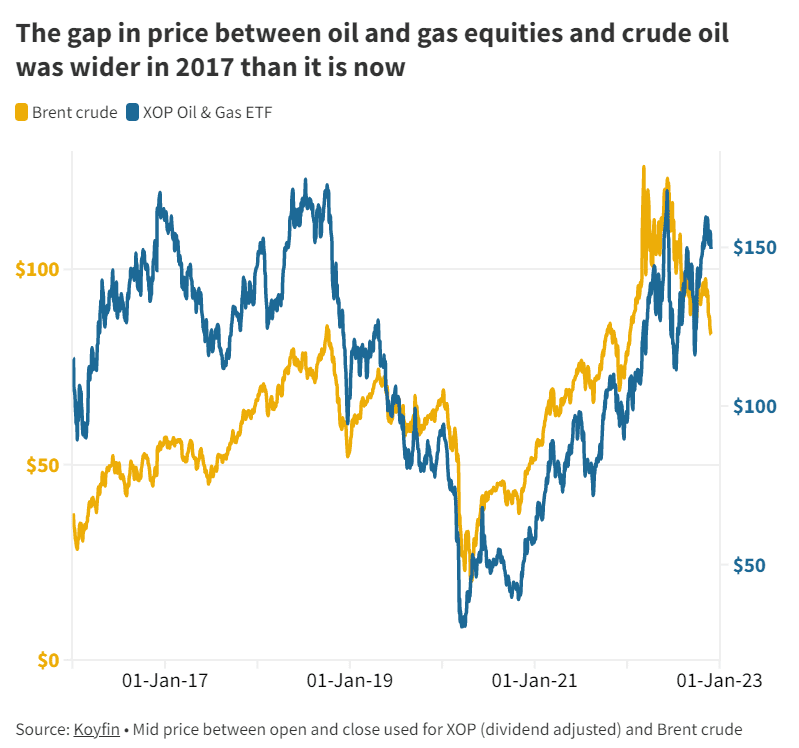 Například cenový rozdíl mezi fondem SPDR Oil & Gas ETF, který zahrnuje hlavní společnosti zabývající se průzkumem a těžbou ropy a zemního plynu, a futures kontraktem na ropu ICE Brent Crude činil v úterý přibližně 66,60 USD. To je podle údajů společnosti Koyfin výrazně méně než rozdíl 104 USD zaznamenaný na začátku ledna 2017, jak ukazuje graf níže.