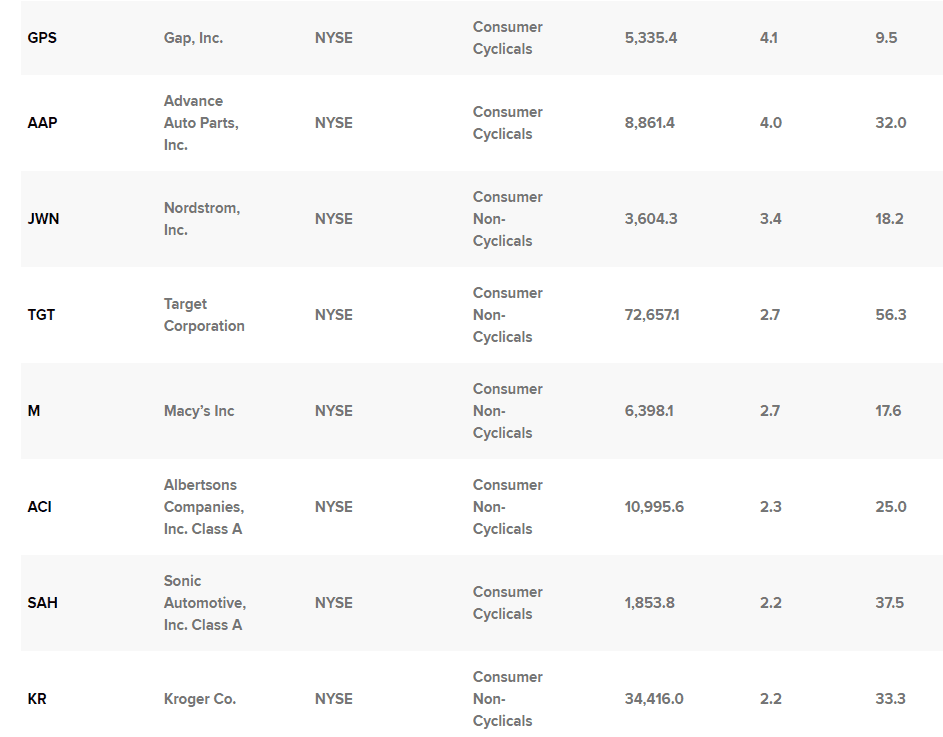 Jako cvičení na zamyšlení jsme se podívali do fondu SPDR S&P Retail ETF, který obsahuje 97 akcií, a hledali jsme nejvyšší dividendové výnosy, přičemž jsme se omezili na maloobchodní společnosti s tržní hodnotou alespoň 1 miliardy USD. Podívali jsme se také na procento analytiků z Wall Street, kteří hodnotí každou akcii jako nákupní, jak moc by každá z nich musela vzrůst nebo klesnout, aby dosáhla průměrné cílové ceny analytiků, a prověřili jsme pouze ty, které jsou pokryty alespoň sedmi analytiky.