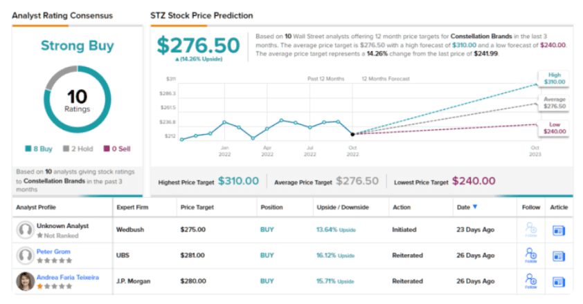 Při pohledu na konsenzuální rozdělení jsou i další analytici nadšeni. Na základě 8 nákupů a pouze 2 podržení (tj. neutrálních) se na ulici říká, že STZ je silná koupě. Průměrná cílová hodnota činí 276,5 USD a představuje 12měsíční výnos 14 % ze současné ceny akcií 242 USD.