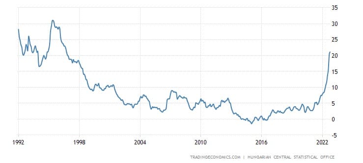 Inflaci v Maďarsku vedle rostoucích nákladů na veřejné služby zvyšují také rostoucí ceny potravin. Ceny energií pro domácnosti vzrostly o 64 %, zatímco ceny potravin o 40 %, což je více než dvojnásobek průměru EU. Ceny chleba, sýrů a vajec se za poslední rok téměř zdvojnásobily, přičemž ceny sýrů a vajec vzrostly o 92 % oproti stejnému období roku 2021.