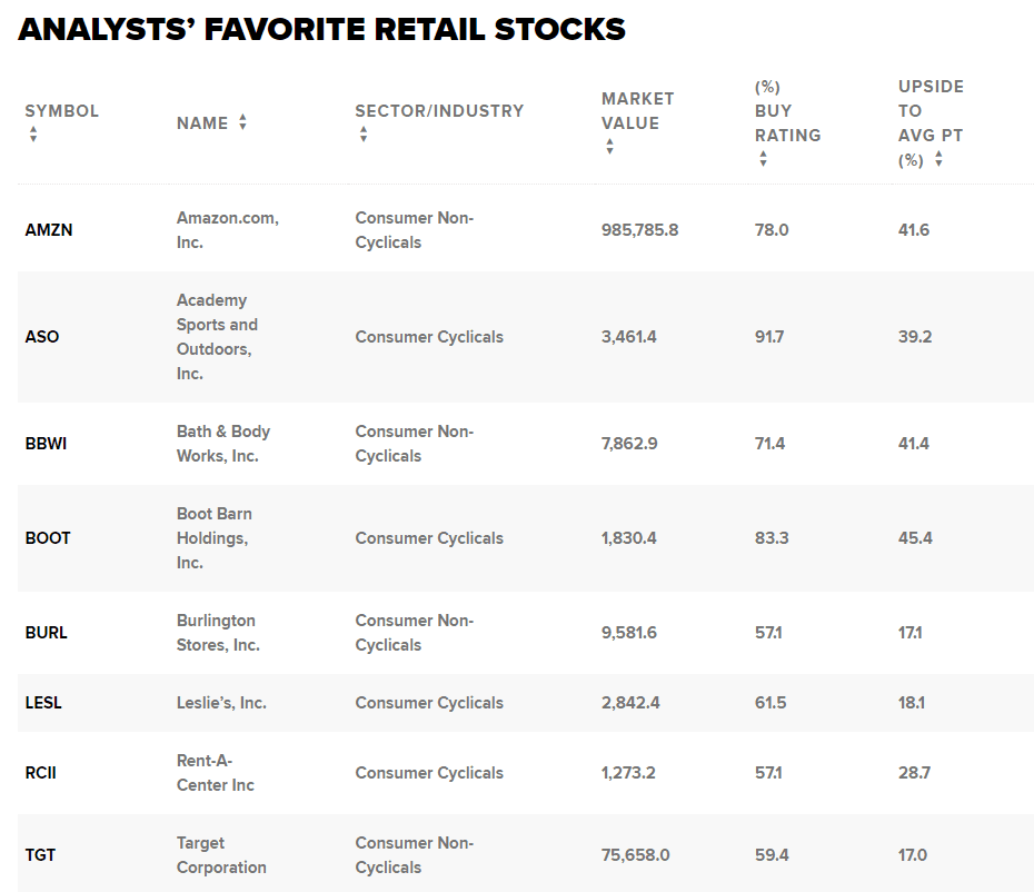 XRT (kromě prodejců automobilů) Nákupní hodnocení od nejméně 55 % analytiků, kteří se zabývají danou oblastí. Růst průměrné cílové ceny o 15 % nebo více Tržní kapitalizace 1 miliarda USD nebo více Pokrytí alespoň šesti analytiky