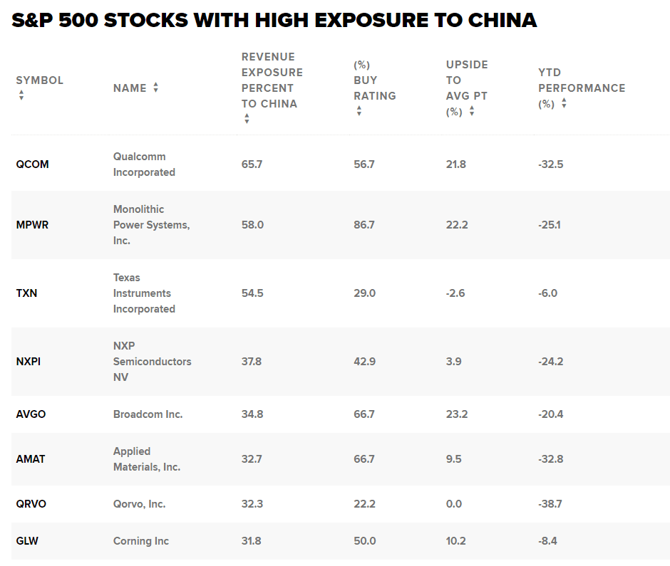 Do seznamu se dostalo také mnoho akcií polovodičových společností, jako jsou Intel, Nvidia a Advanced Micro Devices – včetně Qualcommu, který má v seznamu nejvyšší expozici tržeb vůči Číně. Mnohé z těchto společností sice prodávají čipy výrobcům, kteří je používají v produktech, jako jsou telefony vytvořené v Číně, ale tyto produkty se nakonec prodávají zpět ve Spojených státech, čímž se stírá hranice toho, co jsou jejich koncové trhy.