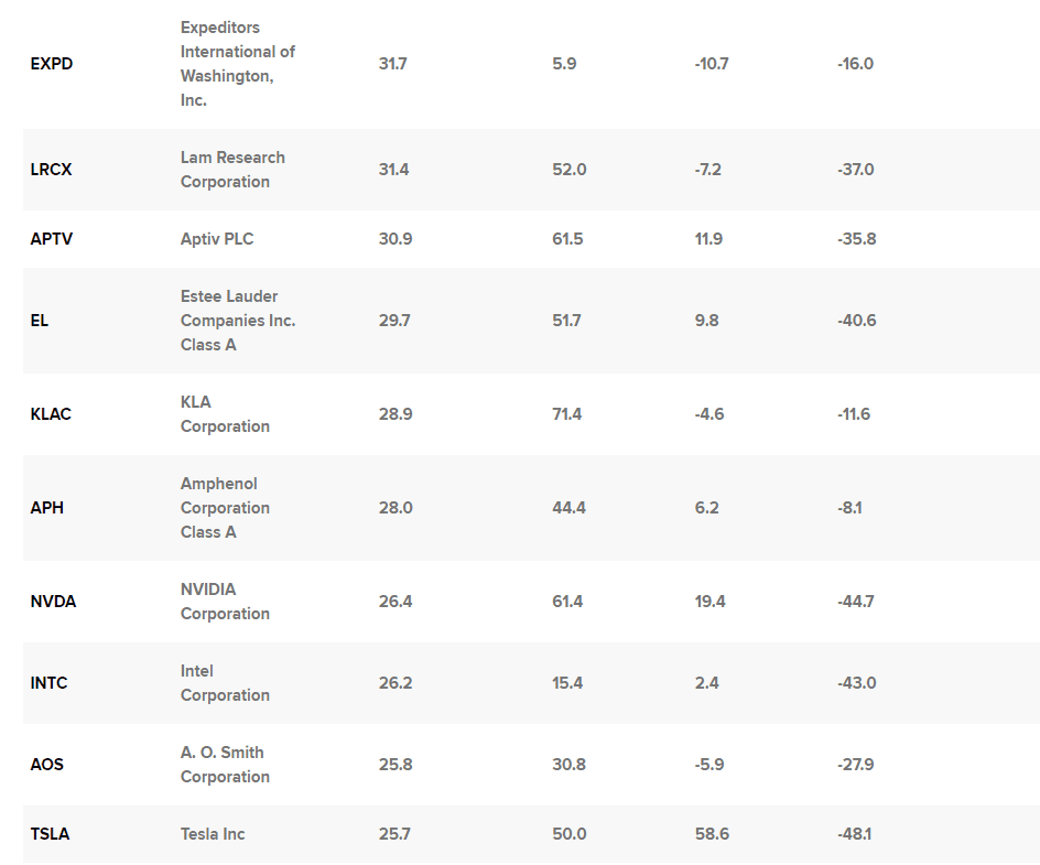 Tesla je největší společností na seznamu podle tržní kapitalizace a více než čtvrtina jejích příjmů pochází z Číny. Kvůli výlukám a omezením v Číně byla letos dočasně zastavena nebo omezena výroba v šanghajské továrně společnosti. Přestože se akcie v roce 2022 v rámci výprodeje na trhu s technologiemi propadly o zhruba 48 %, na základě konsensuálního cílového kurzu by mohly od pátečního závěru vzrůst o téměř 59 %.