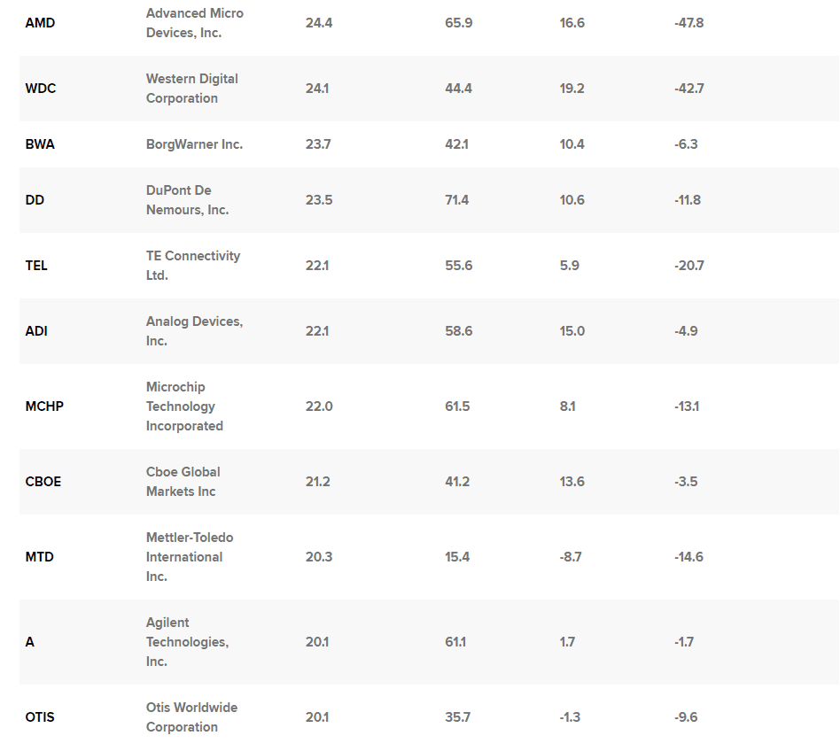 Na seznamu je také chemická společnost DuPont de Nemours. Zhruba 23,5 % příjmů společnosti je vystaveno působení Číny. Akcie se od začátku roku k pátečnímu závěru propadly o zhruba 12 %, ale podle konsensuálních odhadů prostřednictvím FactSet by měly vzrůst o téměř 11 %.