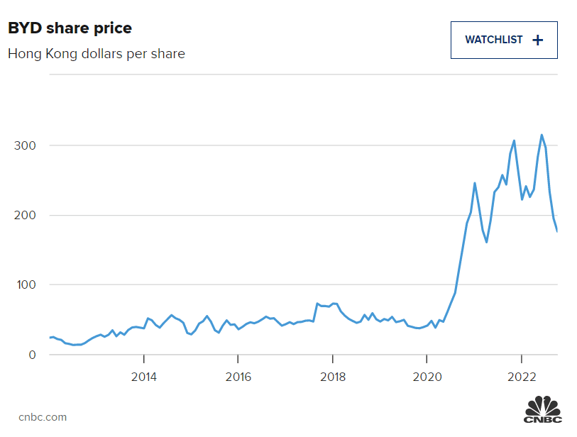 Akcie společnosti BYD, které se v USA obchodují i mimo burzu, letos klesly o 38,8 %, ale za posledních 10 let vzrostly o 600 %.