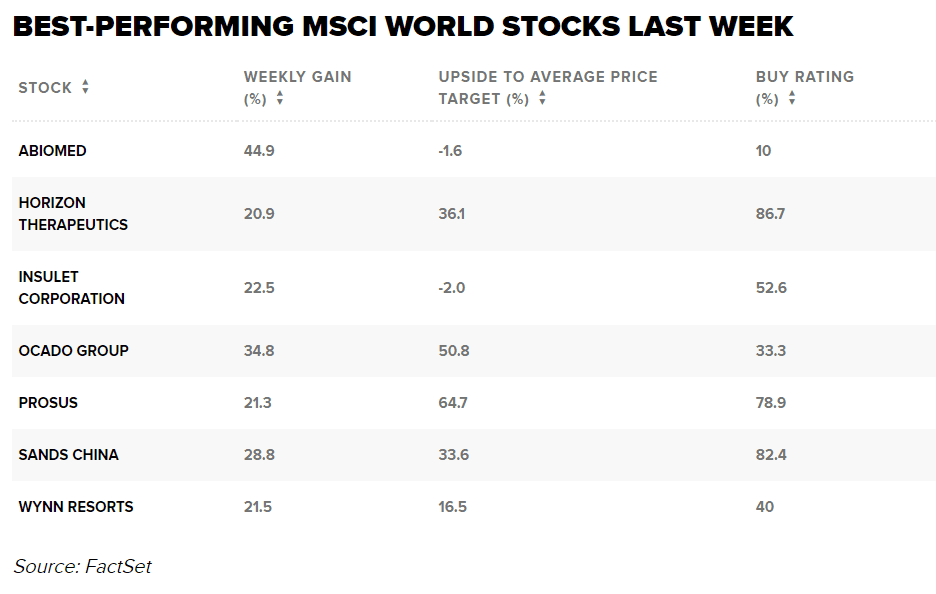 Největší zisk 44,9 % zaznamenala společnost Abiomed díky zprávě z minulého týdne, že ji v hodnotě 16,6 miliardy dolarů koupí společnost Johnson & Johnson. Společnost J&J souhlasila, že zaplatí 380 USD za akcii společnosti Abiomed, což představuje 50,7% prémii oproti pondělní uzavírací ceně 252,08 USD. Akcionáři společnosti Abiomed mají navíc právo získat až 35 USD na akcii v hotovosti, pokud bude dosaženo určitých klinických a obchodních milníků.