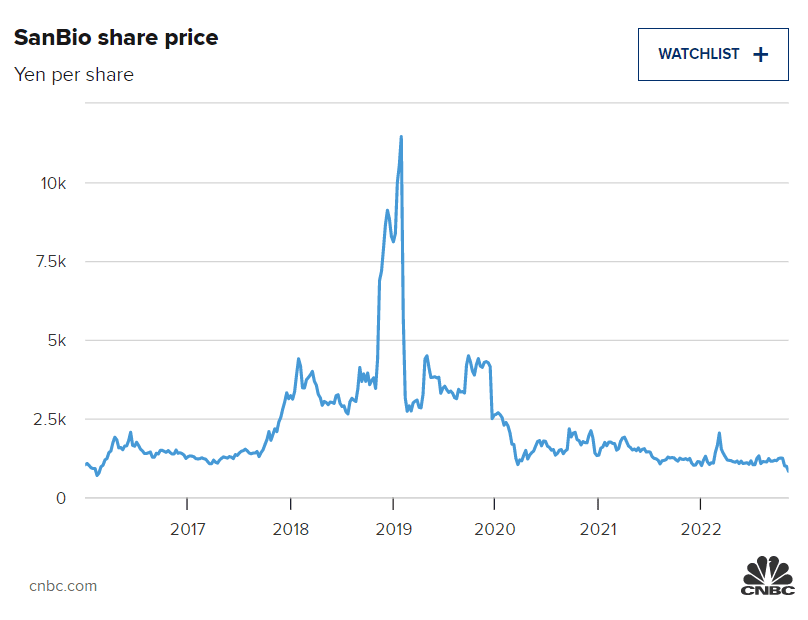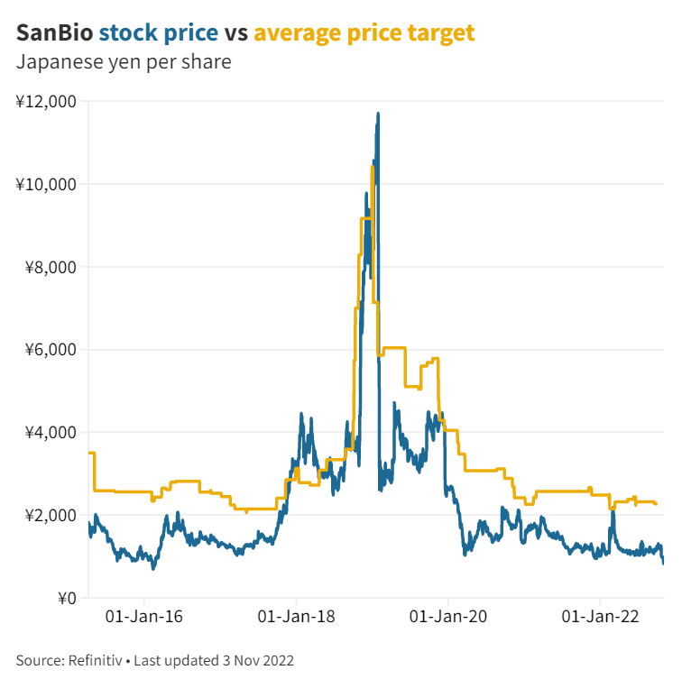 Banka stanovila cílovou cenu akcií na 4 100 jenů (28 USD), které ve čtvrtek uzavřely na 824 jenech. SanBio vyvíjí regenerativní buněčné léky na problémy, jako jsou mrtvice a poranění mozku.