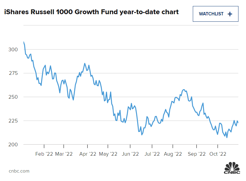 Dodávají, že Russell 1000 Growth již potvrdil dvojitý vrchol, a to vůči hodnotám a indexu S&P 500. The iShares Russell 1000 Growth ETF reprezentuje růstový fond Russell 1000.