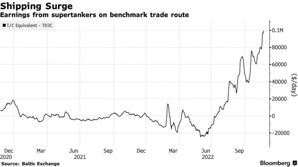 Narušení je poměrně jednoduché. Evropa, která byla po desetiletí největším odběratelem ruské ropy, příští měsíc zakáže nákupy z Moskvy a již nyní je omezuje. Tyto náklady místo toho proudí do Asie. Výsledkem je, že lodě plují tisíce kilometrů dál, což zvyšuje důležitý aspekt poptávky.