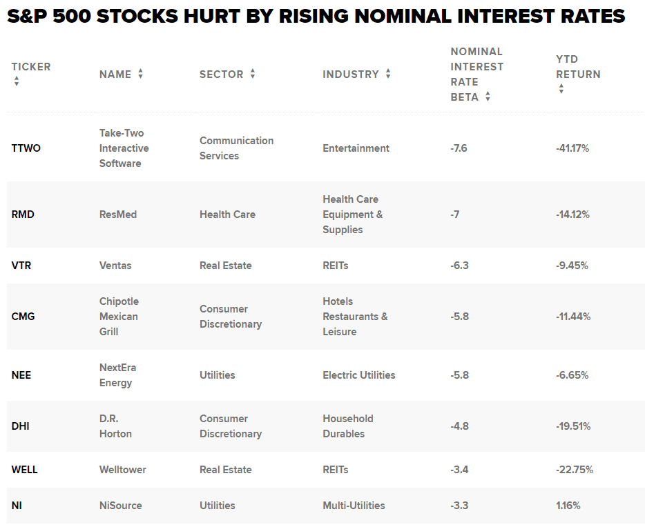 Bank of America nedávno provedla screening akcií v indexu S&P 500 s nejnižšími nominálními úrokovými betami, což znamená, že je poškozují rostoucí nominální úrokové sazby. Screening je založen na regresi měsíčních nadměrných výnosů akcií vůči měsíčním změnám výnosů desetiletých státních dluhopisů od roku 1972 do listopadu letošního roku.