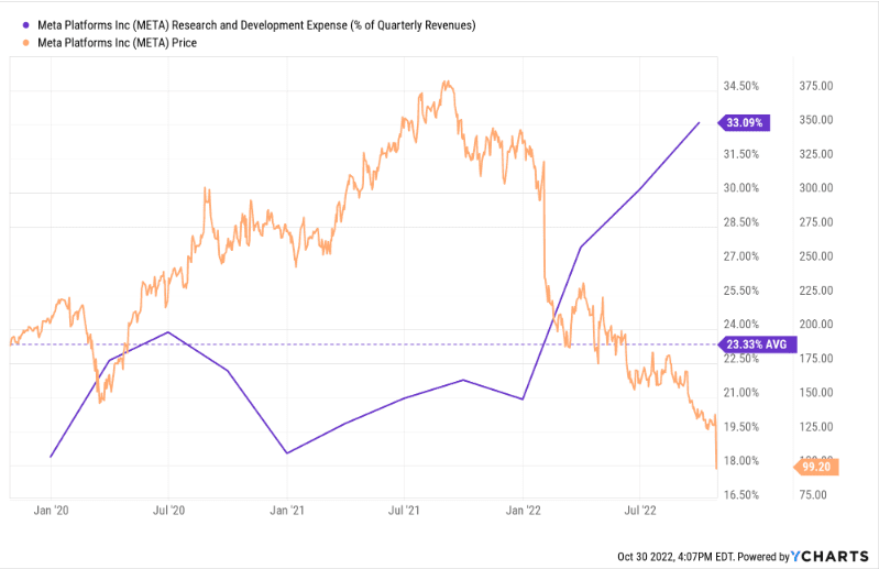 Jak vidíte výše, náklady společnosti Meta na výzkum a vývoj (jako procento příjmů) v roce 2022 prudce vzrostly – z tříletého průměru kolem 23 % na 33 % v posledním čtvrtletí (tři měsíce končící 30. září 2022).
