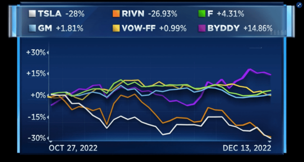 Pro srovnání, ostatní velké automobilky jako Ford, GM a Volkswagen od 27. října mírně vzrostly, stejně jako čínská společnost BYD, která vyrábí elektromobily a baterie. Americký výrobce elektrických nákladních automobilů Rivian za toto období klesl o 27 %.