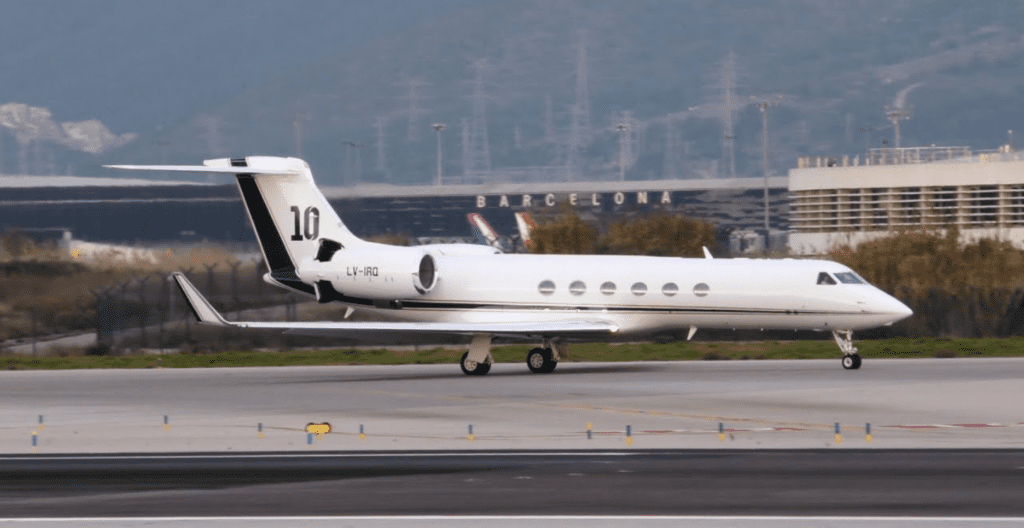 Létá po světě soukromým tryskáčem za 15 milionů dolarů Messiho soukromý tryskáč Gulfstream V z roku 2004 má podle listu South Morning China Post dvě kuchyně a koupelny a pojme až šestnáct cestujících.