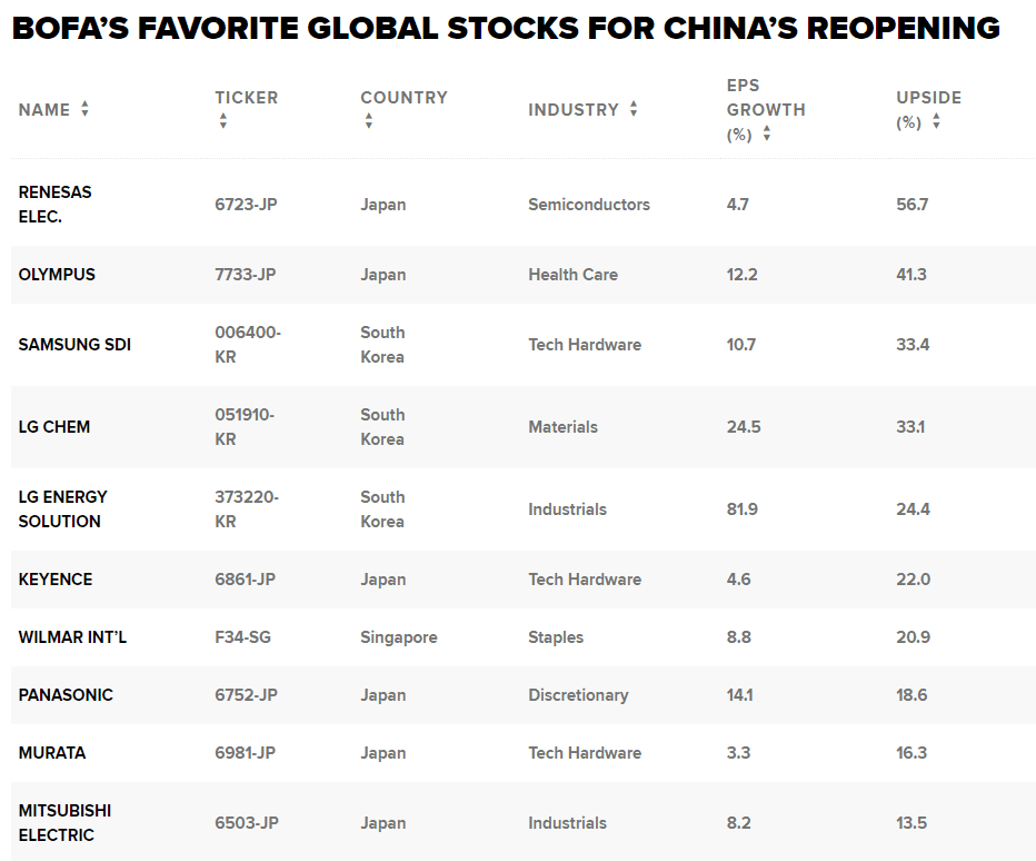 Banka jmenovala 30 globálních akcií vystavených působení Číny, které využívají téma „cyklické a znovuotevírající se“. Dvanáct níže uvedených akcií patří mezi akcie s největším pozitivním nárůstem cen akcií, Bank of America je hodnotí nákupním ratingem a očekává se u nich růst zisku na akcii.