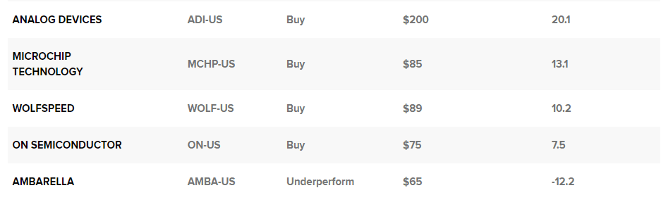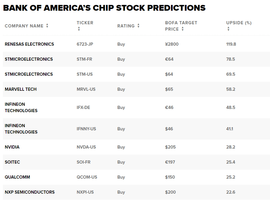 Investiční banka uvedla, že akcie evropského výrobce čipů STMicroelectronics (STM) kótovaného na burze v USA a japonské společnosti RenesasElectronics by díky tomuto trendu mohly v příštím roce vzrůst o více než 75 %.