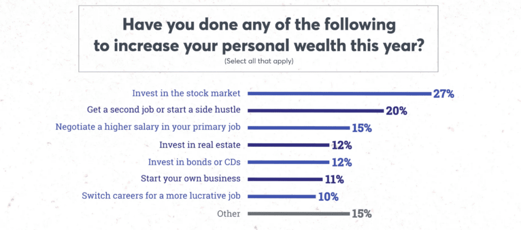 Na otázku, jaké kroky podnikli k vybudování svého osobního bohatství v roce 2022, odpovědělo 27 % Američanů, že investovali na akciovém trhu. To z něj činí nejoblíbenější krok k budování bohatství v tomto roce, jak vyplývá z nedávného průzkumu CNBC Make It: Your Money Survey, který byl proveden ve spolupráci se společností Momentive.