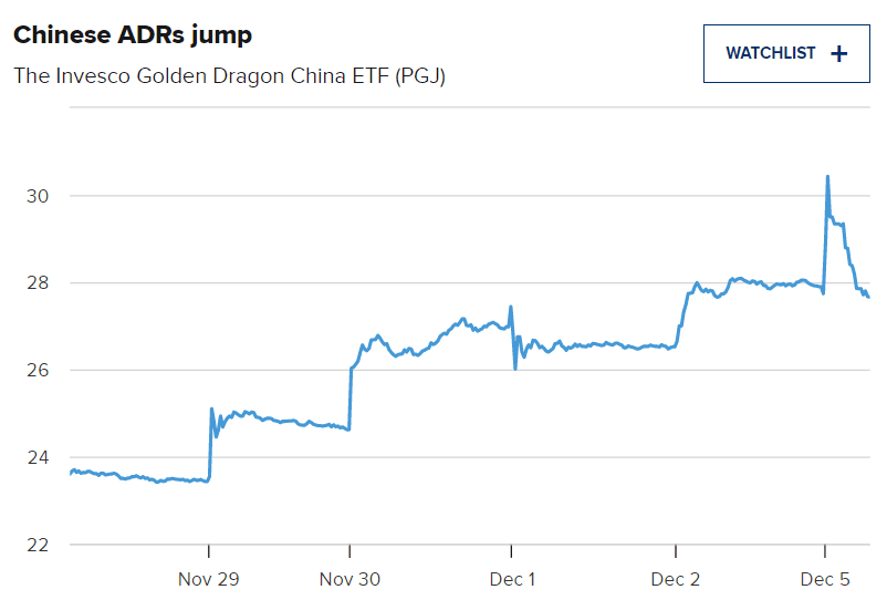 Fond Invesco Golden Dragon China ETF, který sleduje čínský index Nasdaq Golden Dragon, v pondělí vzrostl přibližně o 3 %. Společnosti Alibaba a Pinduoduo vyskočily každá o zhruba 2 %, zatímco Tencent Music Entertainment si připsala 1 %. Čínské značky elektromobilů Nio a XPeng posílily o 4 %, resp. 8 %. Společnost Bilibili posílila o 10 %.