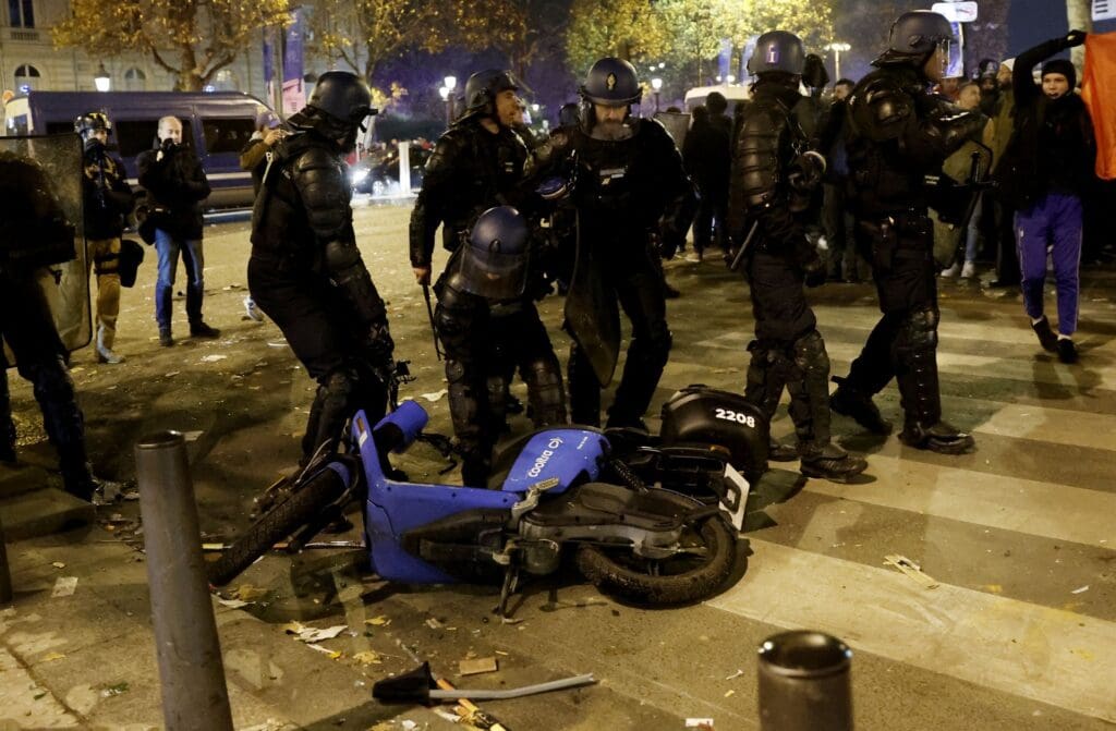 Pařížské oslavy však byly ošklivé. Těžce vyzbrojení policisté se střetli s některými z 20 000 příznivců, kteří se shromáždili podél Champs Elysées. Podle francouzského ministerstva vnitra byl nasazen slzný plyn a přibližně 100 lidí bylo na základě různých obvinění zatčeno.