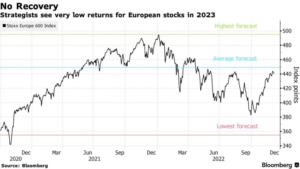 Podle průzkumu agentury Bloomberg mezi 14 stratégy, včetně Goldman Sachs Group Inc. a Bank of America Corp. index Stoxx Europe 600 zakončí rok 2023 na úrovni 449 bodů, což naznačuje růst o méně než 2 % oproti pondělnímu závěru.