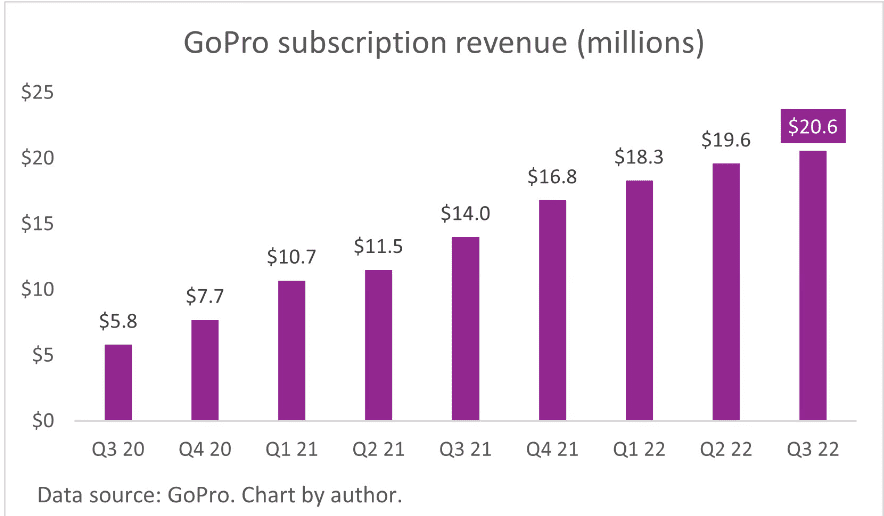 Ve třetím čtvrtletí měla společnost GoPro 2,1 milionu předplatitelů, což představuje meziroční nárůst o 55 %. Podle společnosti by to mohlo v průběhu roku 2023 přinést příjmy přesahující 100 milionů dolarů. Ale ani to není pro investory to nejlepší. Příjmy z předplatného mají hrubou ziskovou marži mezi 70 a 80 %, což je více než dvojnásobek marže společnosti GoPro na hardwaru. To znamená, že do výsledku hospodaření společnosti by mohlo přitéct více peněz.
