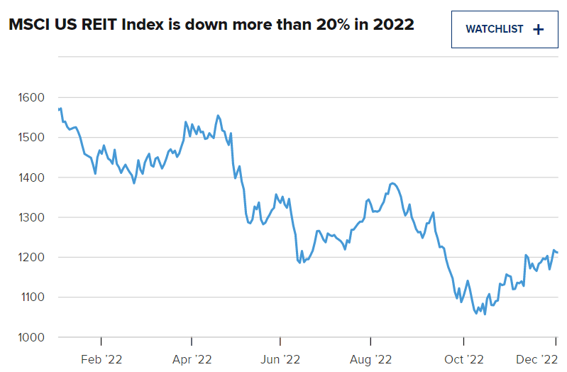 Podle společnosti FactSet klesl index MSCI US REIT v roce 2022 o téměř 21 %. Index má 132 složek, které představují přibližně 99 % amerického světa REIT. Pro srovnání, index S&P 500 letos zatím ztratil přibližně 11 %.