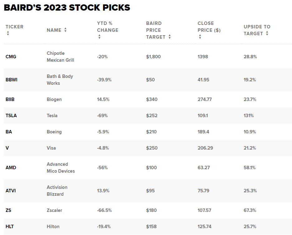 Wall Street zažila obtížný rok 2022, kdy se akcie zaměřené na technologie a růst propadly na pozadí rostoucích sazeb, rychlé inflace a obav z hrozící recese. Očekávejte, že tyto problémy budou přetrvávat i v novém roce, ale některé názvy jsou lépe připraveny na to, aby protivětrům odolaly.S tím, jak se rok 2022 přehoupl do své druhé poloviny, odhalila firma se sídlem v Milwaukee své nejlepší nápady na akcie pro rok 2023. Toto jsou některé z technologických, zdravotnických, maloobchodních a spotřebitelských společností, které doporučuje.Akcie společnosti Tesla Inc. se letos dostaly pod prodejní tlak v souvislosti s převzetím společnosti Twitter Elonem Muskem. Společnost Baird snížila cílovou cenu pro akcie na 252 USD za akcii, ale stále vidí příležitost pro výrobce elektromobilů, aby více než zdvojnásobil úterní zavírací cenu.Začátkem tohoto měsíce Tesla klesla kvůli rostoucím obavám z poptávky, když společnost začala nabízet slevy na některé své dražší modely. Zpráva o prodloužené odstávce továrny v Šanghaji srazila v úterý akcie Tesly o více než 11 %. Akcie Tesla se letos propadly o 69 % a mají nakročeno k nejhoršímu měsíci, čtvrtletí i roku v historii.„Pozorně sledujeme poptávku a zatím se nedomníváme, že by se jednalo o zásadní problém,“ napsal Ben Kallo, analytik společnosti Baird, s tím, že Tesla by měla těžit ze zákona o snížení inflace a jeho pobídek k zavádění elektromobilů. „TSLA má stále mnoho poptávkových pák, které může využít, mimo jiné včetně většího počtu leasingů vozidel a bezplatného nabíjení v celé síti,“ napsal analytik.Chcete využít této příležitosti?Dalším hlavním kandidátem na akcie pro rok 2023 je poražený výrobce čipů Advanced Micro Devices . Akcie polovodičů patřily v letošním roce k nejhorším na Nasdaqu, protože se potýkaly s přetrvávajícími omezeními nabídky a zpomalením poptávky po spotřebitelských produktech, jako jsou osobní počítače. Přestože se akcie AMD propadly o 56 %, na základě cílové ceny společnosti Baird by mohly vzrůst o 58 %.Analytici rovněž označili společnost Bath & Body Works za nejlepší volbu do roku 2023. Pozice značky jako předního specializovaného prodejce parfémů s konzistentními cykly doplňování produktů by měla stabilizovat poptávku i v době poklesu, napsal analytik Mark Altschwager. Jmenování nového generálního ředitele by podle něj mělo také posílit důvěru investorů v budoucnost.Přestože se akcie letos propadly o 40 %, mohly by oproti úternímu závěru posílit až o 19 %. Na společnost Bath & Body Works sází také banka Goldman Sachs, která začátkem tohoto měsíce ve svém sdělení klientům uvedla, že se jedná o nejlepší maloobchodní akcie pro rok 2023.Akcie společnosti Chipotle Mexican Grill mohou podle společnosti Baird od úterního závěru posílit o téměř 30 %. Investiční banka připustila, že akcie společnosti provozující rychlé občerstvení jsou drahé. Tato prémie je však oprávněná vzhledem k tomu, že Chipotle má předpoklady k solidnímu růstu zisku na akcii a dvoucifernému růstu tržeb v čase, napsal analytik David Tarantino.„Úsilí o posílení provozu by mohlo v roce 2023 přinést zlepšení provozních výsledků navzdory možným ekonomickým překážkám,“ uvedl.Společnost Baird rovněž jmenovala společnosti Biogen, Hilton, Boeing, Visa a Activision Blizzard, která je cílem převzetí společností Microsoft, jako nejlepší volby pro nový rok.