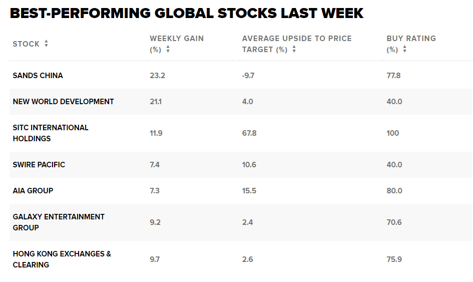 Provozovatel kasina Sands China si v průběhu minulého týdne polepšil o 23,2 %. Jedná se o druhý týden po sobě, kdy vzrostl o více než 20 %, přičemž akcie se vezly na zprávě, že Sands China patří mezi šest provozovatelů kasin, kterým byly vydány nové licence pro provoz v Macau – největším světovém centru hazardních her.