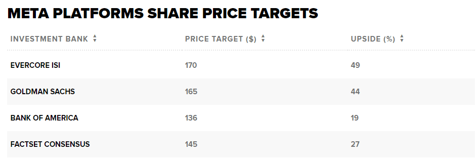 „Nadále se zaměřujeme na rozsáhlé publikum společnosti Meta v rámci její rodiny aplikací, na jejichž základě může společnost pokračovat v přizpůsobování vyvíjejících se spotřebitelských návyků v rámci krátkých videí, zasílání zpráv, obchodování, rozšířené reality & sociálních vazeb,“ uvedli analytici Goldman Sachs a dali akciím cílovou cenu 165 USD.