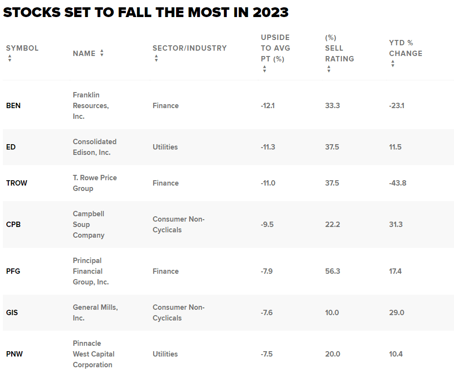 Server CNBC Pro se podíval na akcie, které podle společnosti FactSet mohou v roce 2023 nejvíce ztratit na základě průměrné cílové ceny analytiků. Zahrnuli jsme také procento prodejních hodnocení mezi analytiky, kteří tyto akcie pokrývají, a jejich dosavadní letošní výkonnost.