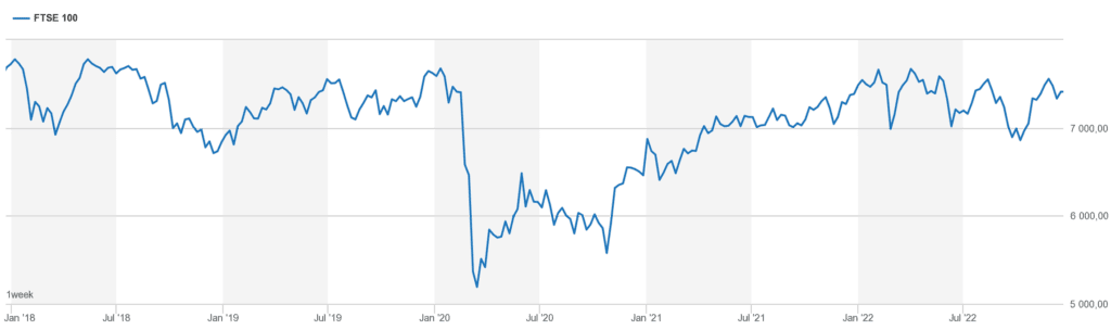 Index FTSE 100 za 5 let – Zdroj: londonstockexchange.com