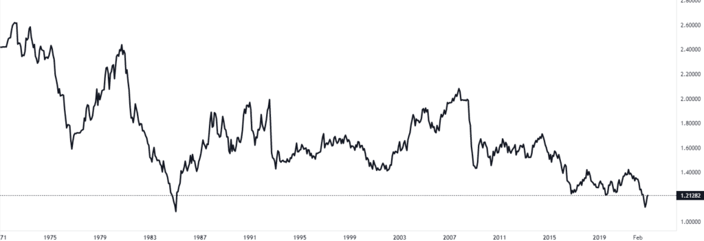 Vývoj britské libry vůči dolaru od 1970 – Zdroj: Tradingview.com