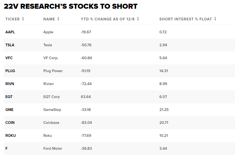 S využitím technického bodovacího systému, který hodnotí akcie od nejslabších po nejsilnější, analytik John Roque ve středečním sdělení klientům nastínil řadu akcií, které je vhodné shortovat před svátky.Short-selling neboli prodej akcií na krátko je postup, kdy se vsadí na akcie tím, že se vypůjčí akcie a prodají se s plánem odkoupit je za nižší cenu a z rozdílu profitovat. Je to strategie, kterou běžně používají hedgeové fondy.Zde jsou některá jména, na která Roque upozornil:Roque mezi svými tipy vyzdvihl silně shortované akcie GameStop a poukázal na neúspěšné pokusy o rally od září.Roque napsal, že podpora na úrovni 20 USD „nevydrží“. „Riziko se pohybuje v nízkých jednociferných hodnotách.“Chcete využít této příležitosti?Společnost GameStop se v roce 2021 dostala na titulní stránky novin po rally, kterou vyvolali drobní investoři komunikující prostřednictvím sociálních médií, jako je Reddit. Skok v ceně akcií poškodil prodejce nakrátko a hedgeové fondy sázející proti prodejci videoher.Akcie vzrostly ve čtvrtek – den poté, co GameStop zveřejnil pokles tržeb ve třetím fiskálním čtvrtletí a také čistou ztrátu ve výši téměř 95 milionů dolarů. Akcie se letos propadly o více než 33 %.Pokud jde o akcie společnosti Tesla , Roque poukázal na to, že dlouhodobě vytváří vzorec „hlava a ramena“ s vrcholem.Jeho technický cíl pro Teslu je 100 USD, což je téměř o 45 % níže.Roque do svého seznamu zařadil také technologického giganta Apple . Akcie výrobce iPhonů se letos propadly o téměř 20 %, protože technologický sektor tíží obavy o růst a společnost trpí problémy s dodávkami, které jsou podpořeny omezením výroby v Číně.Podle údajů společnosti FactSet byly mezi dalšími jmény akcie společnosti Rivian vyrábějící elektromobily a kryptoburza Coinbase , u nichž bylo shortováno přibližně 9 % a téměř 21 % jejich příslušných akcií. Roque také přidal vlastníka společnosti North Face, společnost VF Corp , která nedávno oznámila snížení vedení a výměnu generálního ředitele.