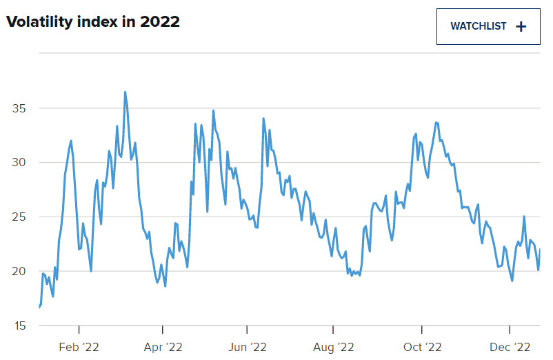 Zmírnění volatility, které vyvolá velkou rallye Další částí Leeho teorie je, že jakmile Fed změní svou politiku, volatilita na akciovém trhu se propadne. Společnost Fundstrat poznamenala, že index volatility CBOE. v letošním roce v průměru pohyboval nad úrovní 25, což je „mimořádně“ vysoké číslo, které bylo překonáno pouze v letech 2008, 2009, 2020, 2002 a 2001. Takzvaný VIX je odvozen od cen opcí na index S&P 500.