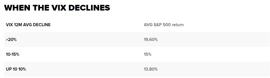 Společnost Fundstrat rovněž poznamenala, že pozitivní výnosy jsou při poklesu indexu VIX konzistentní. V 19 případech došlo k poklesu 12měsíčního průměru VIX oproti předchozímu roku a v 18 z těchto případů byl akciový trh vyšší.