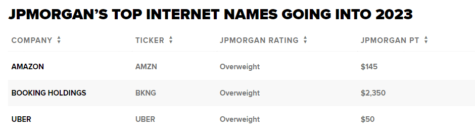 Fond Technology Select Sector SPDR se od začátku roku propadl o více než 25 %, čímž překonal zhruba 15% ztrátu indexu S&P 500 za stejné období. Technologický index Nasdaq Composite letos také zaostává za ostatními indexy a zatím ztratil více než 29 %.Přesto jsou někteří analytici na Wall Street ohledně některých internetových jmen optimističtí. Zejména banka JPMorgan vidí v posledních týdnech roku 2022 a směrem k roku 2023 dobře fungovat pět akcií.Amazon je první akcií na seznamu společnosti JPMorgan, která je připravena dosahovat dobrých výsledků.„Sekulární posun, příznivé kompenzace a rostoucí disciplína dávají společnosti Amazon dobrou pozici do roku 2023,“ napsal analytik Doug Anmuth ve svém komentáři z počátku tohoto týdne.Firma vidí jako pozitivní pro Amazon posun směrem k růstu elektronického obchodu a cloud computingu, což podpoří budoucí růst tržeb společnosti. Anmuth předpokládá, že tržby v roce 2023 vzrostou meziročně o více než 15 %, a to díky pokračujícímu přechodu k online nakupování a většímu rozšíření v kategoriích, jako jsou potraviny, oblečení a doplňky, nábytek a spotřebiče. Tento růst by podle něj měly podpořit cloudová jednotka AWS a reklamy.Chcete využít této příležitosti?Na Anmuthově seznamu je také online cestovní společnost Booking Holdings . Společnost podle něj těží z oživení cestovního ruchu a myslí si, že má atraktivní marže, alokaci kapitálu a ocenění.Ve třetím čtvrtletí byly hrubé rezervace provedené u společnosti výrazně nad úrovní roku 2019, což podle poznámky signalizuje solidní oživení. Disciplinované investice do nových produktů a marketingu, stejně jako zdravý program zpětného odkupu akcií, by měly pomoci zvýšit cenu akcií, uvedl Anmuth.Platforma pro sdílení jízd Uber je také nejlepším tipem vzhledem k odolnosti mobility a stabilnímu provozu dodávek.„Mobilita vykazuje odolnost vůči makrozásahům, přičemž říjen se stal historicky nejlepším měsícem pro hrubé objednávky mobility a více než 70 % nových řidičů uvedlo jako důvod nástupu ve 3. čtvrtletí inflaci,“ uvedl Anmuth.Kromě toho Uber zahájil provoz ve Francii, Španělsku, Japonsku, na Tchaj-wanu a v Chile, kde ve třetím čtvrtletí získal více než 10 milionů nových členů. Uzavřela také nové partnerství se společností Capital One, které by mělo přispět ke zvýšení růstu.