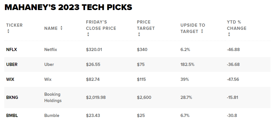 Pro tento sektor to byl těžký rok, kdy se ocenění propadlo z rekordních hodnot v prostředí definovaném rostoucími sazbami a obavami ze zpomalení hospodářského růstu. Na tomto pozadí se technologický index Nasdaq Composite propadl o více než 31 % oproti svému vrcholu a přibližně o 30 % v letošním roce, ale na obzoru se může rýsovat návrat.Zatímco v roce 2022 se Mahaney díval na tento sektor opatrně, pokles odhadů i násobků spolu s iniciativami na snižování nákladů, jako je propouštění, podle něj staví mnoho z těchto jmen do pozice „příležitosti na zisk na akcii“, až v roce 2023 nebo 2024 dojde k oživení.Zdroj: Getty Images„Do roku 23 bychom vyzdvihli zejména akcie, u nichž se domníváme, že: a) modely příjmů jsou přiměřeně odolné vůči recesi; b) existují nové produktové cykly a c) již byla přijata opatření v oblasti nákladů,“ napsal analytik Evercore ISI.Zde jsou některé Mahaneyho oblíbené internetové tituly:Akcie společnosti Netflix letos utrpěly jeden z nejhorších propadů a propadly se o 47 %, protože společnost sdílela ztráty předplatitelů a bojovala s rostoucí konkurencí v oblasti streamování.Akcie se od svých minim odrazily a od 1. července nabízejí 76% výnos. Velké banky jako Bank of America a Wells Fargo nedávno zvýšily hodnotu akcií, protože vidí růst v reklamou podporované úrovni Netflixu. Podobně i Mahaney považuje levnější úroveň podporovanou reklamou za nabídku mírně chránící před recesí, která může rovněž vést k opětovnému zrychlení růstu tržeb.Chcete využít této příležitosti?Na prahu nového roku se Mahaneymu líbí také Uber , přičemž cílová cena firmy naznačuje, že akcie mohou oproti pátečnímu závěru téměř ztrojnásobit. Přestože v posledním čtvrtletí utrpěl gigant v oblasti sdílení jízd ztrátu, zveřejnil silné výhledy do budoucna a překonal tržby, protože výluky se zmírňují a spotřebitelé se vracejí k cestování. Akcie v letošním roce klesly o 37 %.Mahaney také jmenoval Booking Holdings mezi svými nejlepšími internetovými tipy a vyzdvihl celkovou tržní příležitost společnosti v hodnotě zhruba 1,1 bilionu USD a obchodní model s nízkou hodnotou aktiv. Akcie Booking se letos propadly o 16 %. Mahaneyho cílová cena 2 600 USD naznačuje, že by akcie mohly oproti pátečnímu závěru posílit o 29 %.V nedávném rozhovoru pro pořad „Closing Bell“ televize CNBC Mahaney označil Booking za jednu ze svých oblíbených cestovních her na prahu nového roku, a to vzhledem k pevnému manažerskému týmu a opatrnému přístupu ke struktuře nákladů.„Pravděpodobně by mohli růst rychleji – po kovidové pandemii, po normalizaci – než tomu bylo ještě v roce 2019,“ řekl. „To je dobrý příběh, který se dá dát dohromady.“Na Mahaneyho seznamu nejlepších firem se objevila také jména jako aplikace pro online seznamování Bumble a společnost Wix , která se zabývá webovým softwarem.