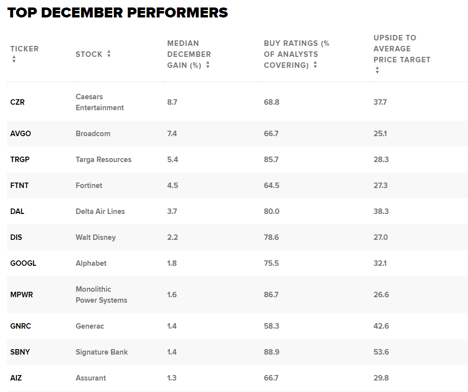 V dnešním článku jsme se rozhodli na toto téma podívat trochu celistvěji a z historické perspektivy. Vzali jsme si k tomu do ruky nástroj, který v české republice sice není tak známý, mezi americkými investory ale již po několik desetiletí platí za hotovou bibli. Jedná se o knihu…Podle almanachu Stock Trader’s Almanac dosahuje index S&P 500 od roku 1950 průměrného zisku 1,5 %. To z něj dělá třetí nejlepší měsíc v průměru širšího tržního indexu za toto období.Vzhledem k těmto skutečnostem prověřil server CNBC Pro nejlepší výsledky indexu v posledním měsíci roku.Každá akcie na seznamu má za posledních 10 prosinců průměrný zisk alespoň 1 %, nákupní hodnocení od 55 % nebo více analytiků, kteří se danou akcií zabývají, a alespoň 25% potenciální nárůst průměrné cílové ceny akcie. Pro jistotu je třeba říci, že minulá výkonnost není ukazatelem budoucích výnosů.Zde je 15 akcií:Akcie kasina Caesars Entertainment vynikají jako akcie s nejvyšším mediánem zisku 8,7 %. Téměř 70 % analytiků, kteří se touto akcií zabývají, ji hodnotí jako nákupní. Caesars se za celý rok propadla o 47 %.Společnost začátkem tohoto měsíce oznámila těsné překonání odhadů zisku za třetí čtvrtletí. Rovněž vykázala silný růst tržeb ve své digitální divizi.Chcete využít této příležitosti?Na seznamu se objevila také společnost Disney , jejíž medián prosincového růstu činil 2,2 %. Z analytiků, kteří společnost Disney pokrývají, jí 78 % dává nákupní hodnocení. Navíc nedávný a náhlý návrat generálního ředitele Boba Igera do společnosti byl vítanou změnou pro akcionáře, kteří touží po tom, aby napravil chybné kroky Boba Capeka. Od té doby akcie vzrostly přibližně o 5 %.Do seznamu se dostalo také několik technologických akcií, včetně Alphabet, Broadcom, Fortinet a Qualcomm. Na seznamu je také finanční akcie poskytovatele platebních technologií Global Payments s průměrným ziskem 1 % za posledních 10 prosinců.Kryptoměnám přátelská Signature Bank má mezitím nákupní hodnocení od přibližně 89 % analytiků a nejvyšší potenciál růstu , a to navzdory nedávnému otřesu na trhu s kryptoměnami. Za celý rok akcie klesly o zhruba 58 %, ale mají průměrný prosincový nárůst o 1,4 %.Do seznamu se dostal také cestovní gigant Delta Air Lines s mediánem prosincového zisku 3,7 %. Akcie má nákupní hodnocení od 80 % analytiků, kteří je pokrývají. Analytici také vidí průměrný růst akcií o 38 %, protože spotřebitelé pokračují v návratu k cestování a investoři čekají, zda je bude následovat i obchodní cestování.