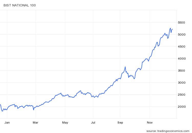 Hodnota referenčního indexu Borsa Istanbul 100 se v dolarovém vyjádření téměř zdvojnásobila, protože domácí investoři hledali zajištění proti inflaci.