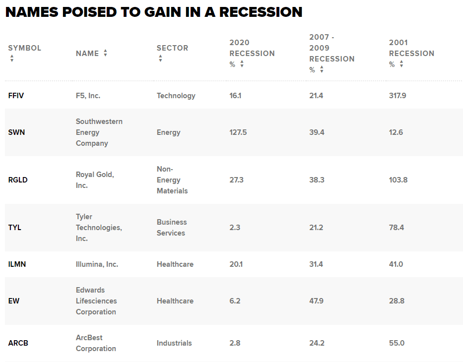Aby bylo možné určit seznam takových akcií, které by odolaly případnému poklesu v důsledku zpřísnění, společnost CNBC Pro prověřila index S&P 1 500 a vyhledala společnosti, které mají alespoň pět analytiků, kteří je pokrývají, a které během posledních tří recesí – v letech 2020, 2007-2009 a 2001 – získaly na hodnotě.